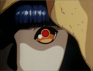 This struck me as a particularly powerful image, the sort of "look you in the eyes" to judge an opponent's intent / personality. The entire cel focus is on the one centered eye. This cel is from a point just before Birdy and Ondine begin their battle in the amusement park.