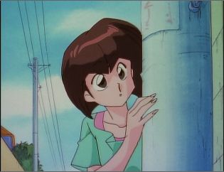 Nabiki is peeking at the drama on the street between Ranma, Ryoga, and Akane as Akane tries to get Ranma to eat her rice cakes.