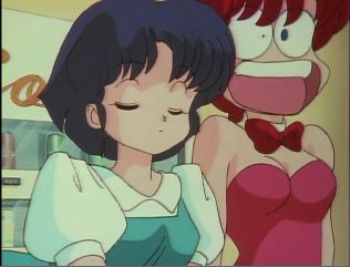 Ranma was handing out pamplets advertising the Tendo dojo. Akane caught him and persuaded him that an appropriately dressed girl would do better. Hence, Ranma ended up in the bunny costume. Here, Ranma-chan is reacting to Akane stepping on her foot.