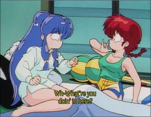 Shampoo wakes up to find that Ranma is now a girl. Akane found Shampoo sleeping with Ranma and poured cold water on Ranma, changing him into a girl and waking Ranma and Shampoo up.