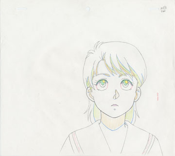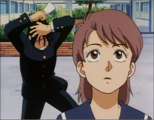 Natsumi Hiyamiya in school uniform looking at exam board for Tsutomu's number while Tsutomu (not shown in cel) goes into hysterics in the background.