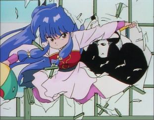Shampoo rips through the Tendo dojo wall with Akane ducking out of the way. Just after this moment, male Ranma defeats Shampoo in defending Akane.