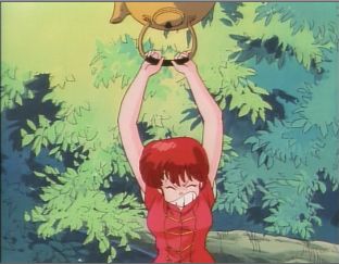 Ranma-chan catching a kettle of hot water that Akane has just tossed to her up on a tree branch.