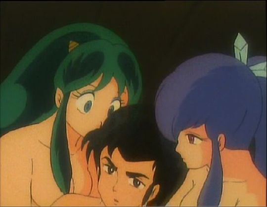 Lum and Oyuki comforting Mendou in a scene Mendou is imagining in the public bathhouse.