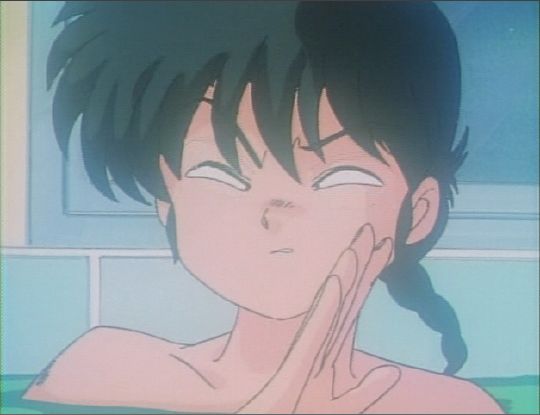 Ranma in the water with no eyeballs. Ranma is reacting to the appearance of Akane at the bathroom door with a wooden sword and a big anger aura as he was just in the process of fending off Ukyo, who is offering to wash his back.
