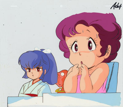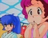 Oyuki and Ran sitting in classroom as children. Ran is worried as teaching machine CAO-2 walks through door that Lum, Benten, and Ran have booby-trapped.