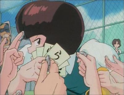 Nabiki is taking bets on the outcome of the fight between Ranma and Ryoga on the schoolgrounds.