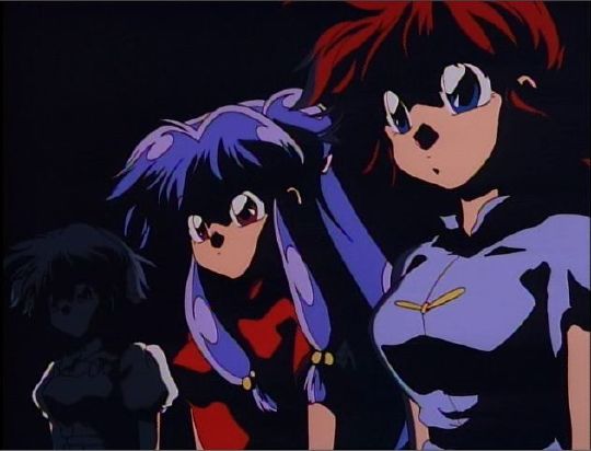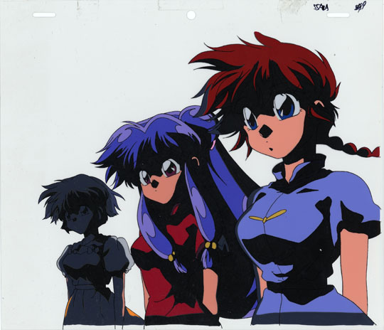 Most of the songs for the series are light-hearted, as would be expected for a comedy, but there is the occasional wistful / longing / sad song. I find the few Ranma cels that I have with this sort of brooding atmosphere to generally be among the most interesting that I have. The girls appear to be solemn witnesses, standing in the shadows, to some event about to unfold.