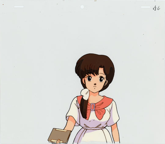 The cel shows Kasumi standing in the doorway of Dr. Tofu's office. She is returning a book to Dr. Tofu. Akane and Ranma are in the office with Dr. Tofu as Kasumi enters. Ranma is being treated for an injury inflicted by Akane when Dr. Tofu causes Ranma further injury as he goes into his love-struck mode upon seeing Kasumi enter.
