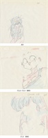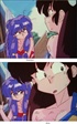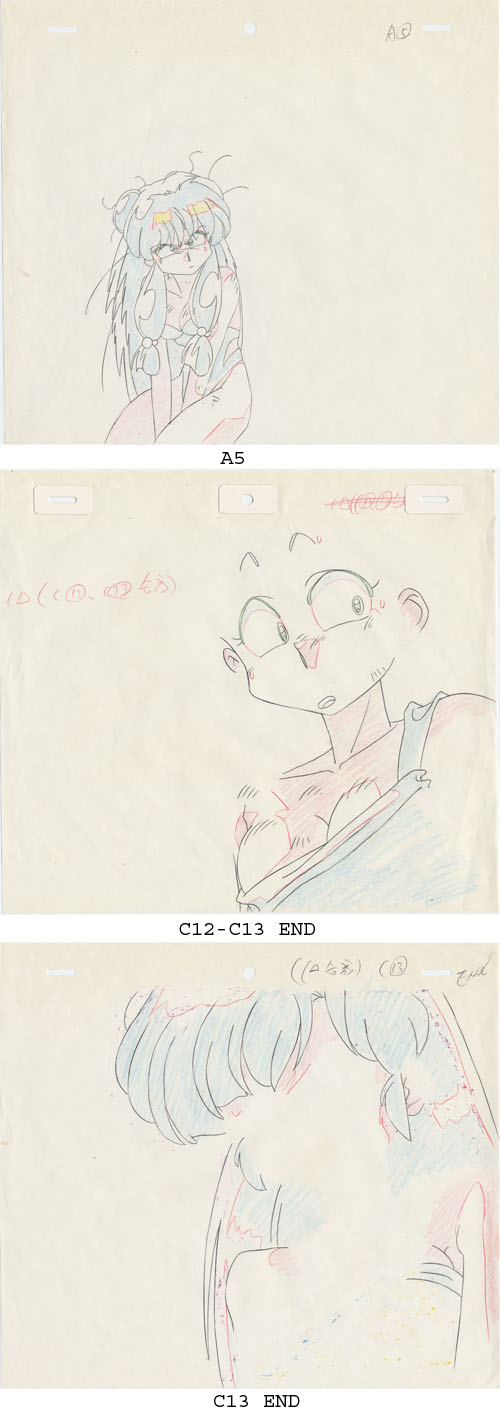After the Miss Beachside contest has resulted in neither Shampoo nor Ukyo winning and the two have scuffled, they both turn as they hear the approach of Tsubasa, being chased by Neko Cat. There are two cel layers in the image. The A5 image of Shampoo occurs while Ukyo is still facing Shampoo. The C13 image of Ukyo occurs at the end of the sequence after Ukyo has completed her turn to look behind her for the onrushing disturbance.