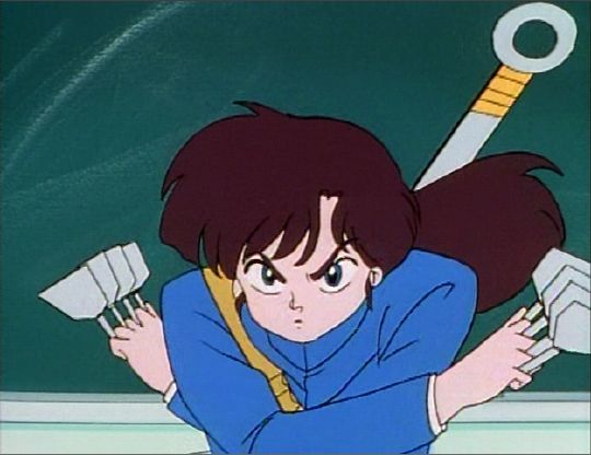 This is from the first meeting of Ranma and Ukyo as teenagers. Ukyo is standing at the front of the school classroom making okonomiyaki for the class, Ranma yells out that he recognizes him (Ranma still thinks Ukyo is a boy at this point), and Ukyo starts to attack Ranma. Here she is just about to launch her spatulas at Ranma.
