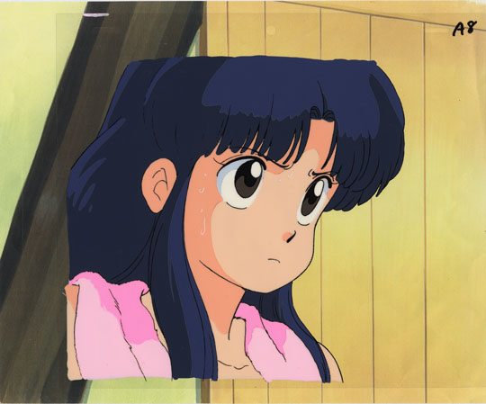 Akane comes back from her morning run and enters the dojo. But she runs back out the front gate surprised at the noise coming from within - the sound of Ranma and Genma practicing. Here in this cel, Akane, pink towel around her neck, is staring in concern through the dojo front gate, before re-entering the dojo.