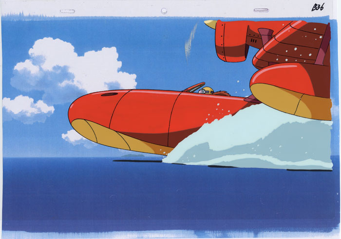 This dynamic cel shows Fio Piccolo's head visible in the front seat of Porco's seaplane as the aircraft makes a dash down the canals away from the Piccolo factory.