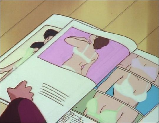 This cel shows a lingerie catalogue that Happosai is perusing while kneeing on the floor. He is arm appears turning the page. He is interrupted by the appearance of Ukyo.