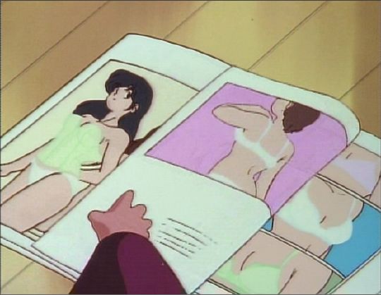 This cel shows a lingerie catalogue that Happosai is perusing while kneeing on the floor. He is arm appears turning the page. He is interrupted by the appearance of Ukyo.