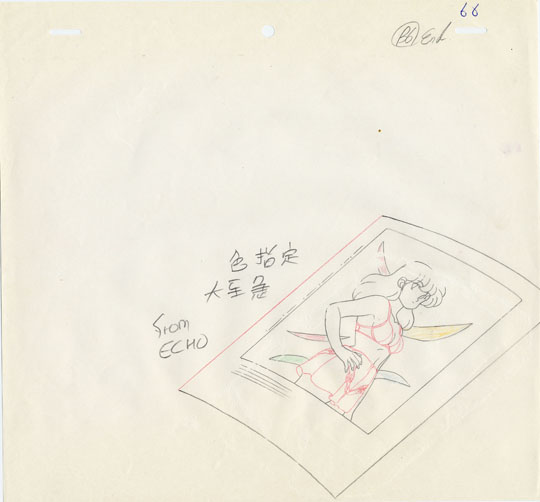 This cel shows a lingerie catalogue that Happosai is perusing while kneeing on the floor. He is interrupted by the appearance of Ukyo.