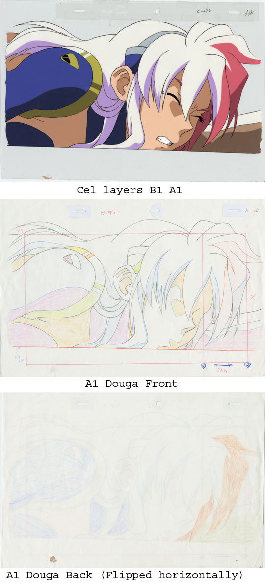Below: Cel without background & Douga (front & back flipped horizontally) and Screen capture