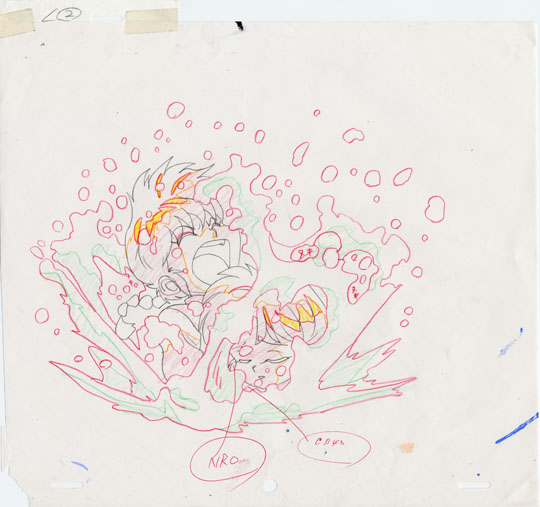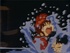 Akane has just been dropped from Kiron's airship into the water. Ranma jumped in to rescue her. Here, Ranma-chan is breaking the water surface, bringing an unconscious Akane to the surface as well.