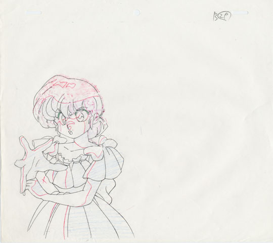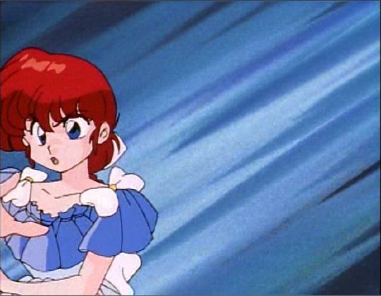 Ranma-chan is at her first dinner party at Picolet Chardin II's mansion. In this scene, Ranma-chan is making a grab at some food with her hand while others grab the food with their extra-long tongues before she can get the food.