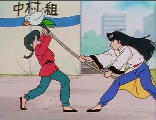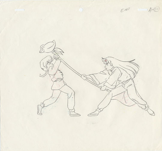 In a battle that Ranma is supposed to throw and let Mousse win, Shampoo upsets the plan by giving Mousse bobby-trapped weapons, such as the duck pole shown in this cel. Here, Ranma blocks the blow from the duck pole held by Mousse.