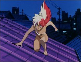 Birdy has just jumped out the bathroom window of Tsutomu's house nude. She lands on the rooftop, shifting from naked to clothed as she lands.