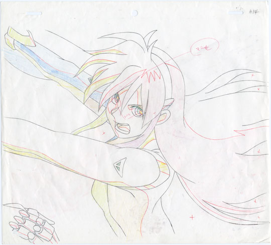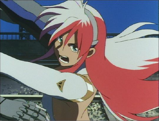 Birdy is fighting with two Arkezoid robots near the train tracks. Here she has grabbed the arms of one of the Arkezoids and is swinging him around.
