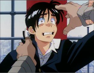 As Geega holds Tsutomu against a girder on a skyscraper under construction, Tsutomu transforms into Birdy. The arm on the right side is the C11 layer and is from 11:38, three seconds before the A12 layer of Birdy after the transformation has finished.
