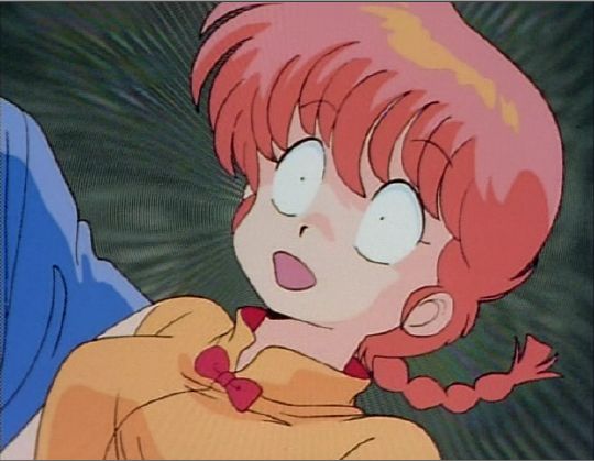 Ranma-chan reacts to being kissed by Mikado Sanzenin, the male half of the Golden Pair ice skating team. Of course, the reason for the shocked look is that this is Ranma's first kiss.
