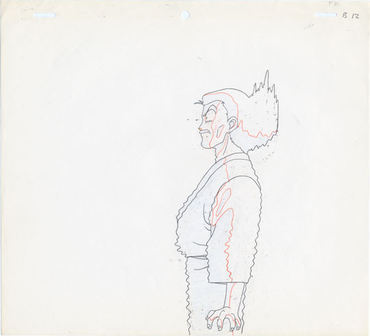 This cel shows Soun's reaction to Ranma's actions. Ranma pours water over his head and then reveals her breasts to Shampoo to show that he is a girl while claiming that he is actually a girl who just disguises herself as a boy.
