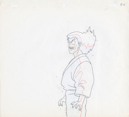 This cel shows Soun's reaction to Ranma's actions. Ranma pours water over his head and then reveals her breasts to Shampoo to show that he is a girl while claiming that he is actually a girl who just disguises herself as a boy.