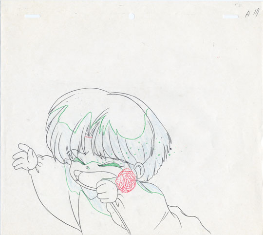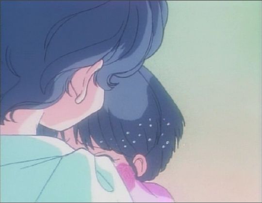 Child Akane is crying because a Carnation she got for her mother is now broken due to Akane's falling down. Here Akane is falling into her mother's comforting embrace.