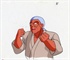 Whoever decided to create this mixture cut out the small image of Lum and stapled it to the cel of Genma. (I removed the staples before scanning it.) The background does not have numbering typical of a Ranma cel, so I assume it came from Urusei Yatsura or, perhaps, just about any old random anime.