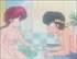 A nude Ranma-chan and a nude Ryoga, in the tub after Ranma-chan has dunked P-chan in the hot water, argue about Ryoga's Jusenkyo problem in the Tendo bathroom. At the moment of this cel, Ranma-chan is telling Ryoga that he should blame the girl and the panda for him falling in the cursed spring, not Ranma. Of course, just a moment later, Genma, in panda form, opens the bathroom door, allowing both Ranma-chan and Ryoga to realize that Ranma-chan and Genma were the girl and panda responsible for Ryoga falling in the cursed spring.