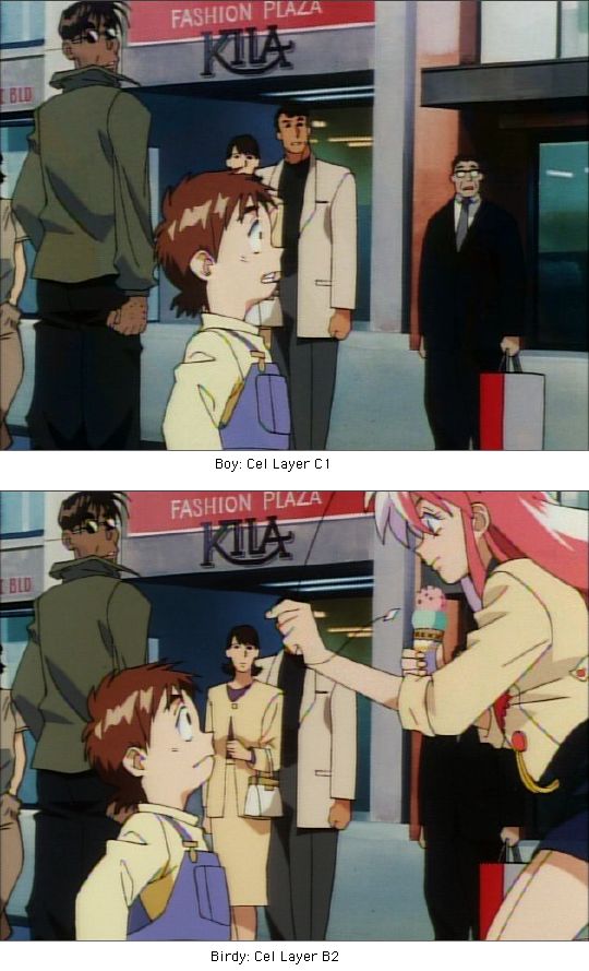 The young boy is showing extreme nervousness as Birdy returns his balloon after jumping higher than humanly possible to retrieve the escaping balloon. Birdy has just treated herself to an ice cream cone as she wanders the streets wearing Hazumi's clothes, which she has "Borrowed" from Tsutomu's sister's room without his sister's knowledge.