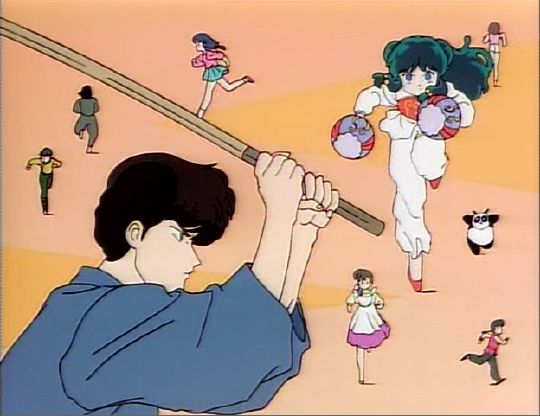 Kuno is lower left. Shampoo is running toward the viewer in the middle. Small characters (left to right) are Ryoga, Soun, Akane, Kasumi, Nabiki, Genma panda, Ranma. The different groups running appear twice in the opening.