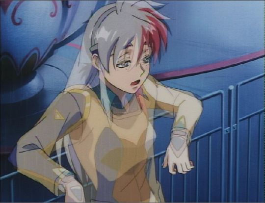 Birdy leans against a fence exhausted after the fight with Ondine in the amusement park. Birdy is transforming into Tsutomu in the screen capture associated with this cel.