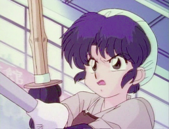 Akane is battling Mariko Konjo, the martial arts cheerleader, after Mariko has knocked out Ranma-chan. Akane is batting away Mariko's baton with a wooden sword.