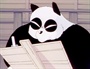 Genma panda is writing on his signboard "I gave birth to you" in response to Ranma's questions about his mother.