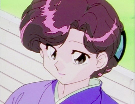 Ranma's mother, Nodoka Saotome, is sitting on a park bench waiting for her son to show up.
