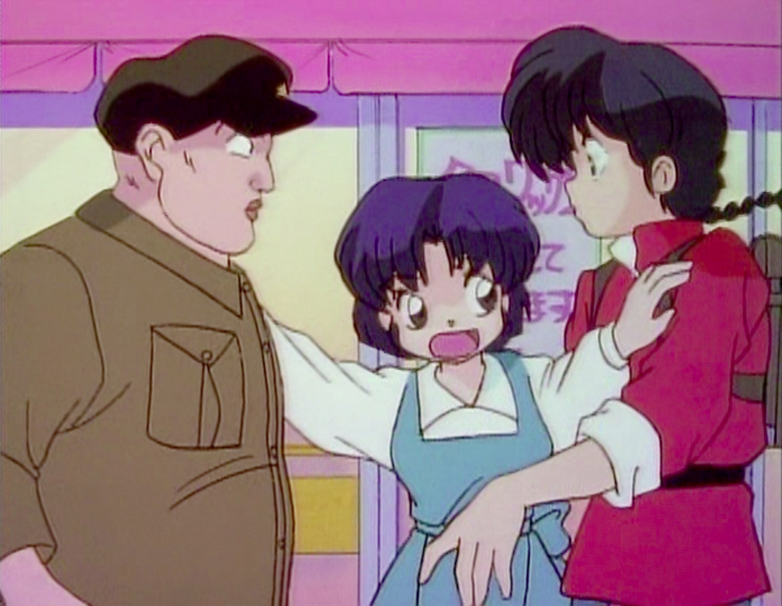 Akane is breaking apart Ranma and the Jusenkyo Guide when Ranma has become upset at the guide's forgetting Ranma and then remembering Ranma as "that clumsy red-hair girl with pig-tail and panda".