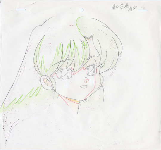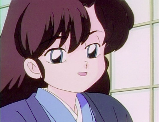 Ukyo, in her yukata, is sitting at the Tendo dining table. After earlier eating Akane's food, Ukyo has received an offer to stay at the Tendo dojo while she recovers from both Akane's food and her disappointment about how her secret sauce turned out. In the sequence of which this cel is part, Ukyo is asking Ranma "Well, if I'm going to stay, will you help?"