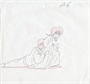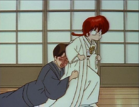 Ranma-chan has awakened after being kipnapped by Sentaro Daimonji. Here Ranma-chan is stomping down the hallway in a wedding kimono dragging Sentaro behind her.