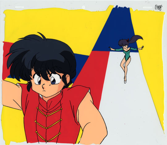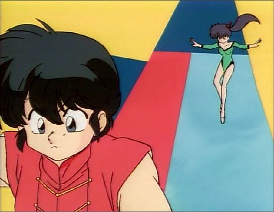 Ranma with Kodachi Kuno sliding down ribbon in pursuit.