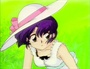 As Akane rises from the ground, the wind blows her hat off.