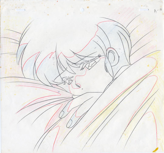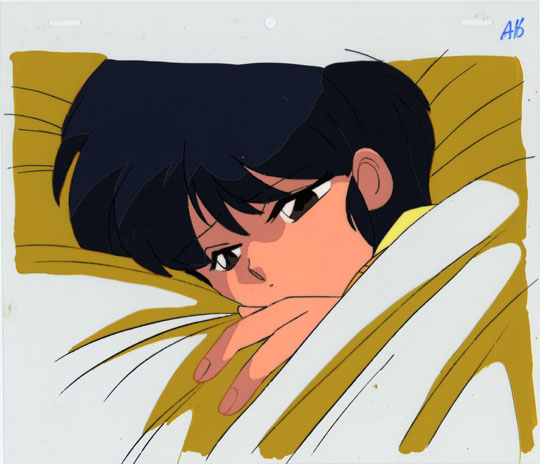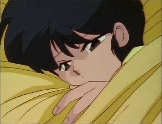 Akane is laying in bed, disturbed by Ryoga's marriage proposal, which he made earlier under the influence of the ghost cat Maomolin.