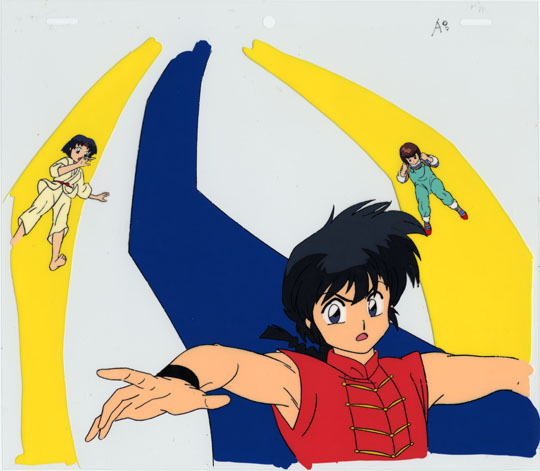 Ranma sliding down blue ribbon followed by Akane and Nabiki on separate yellow ribbons.
