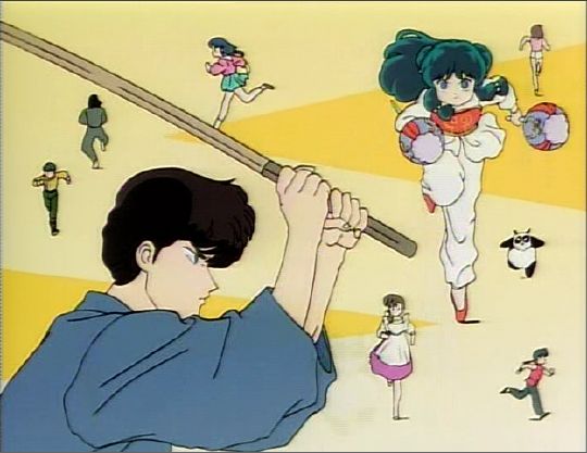 Kuno is lower left. Shampoo is running toward the viewer in the middle. Small characters (left to right) are Ryoga, Soun, Akane, Kasumi, Nabiki, Genma panda, Ranma. The different groups running appear twice in the opening.