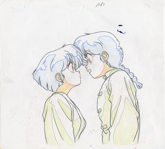 Soun and Genma have just pushed Akane and Ranma together and withdrawn their hands. Both Akane and Ranma show surprise at this turn of events in a scene that is held for a couple of seconds.