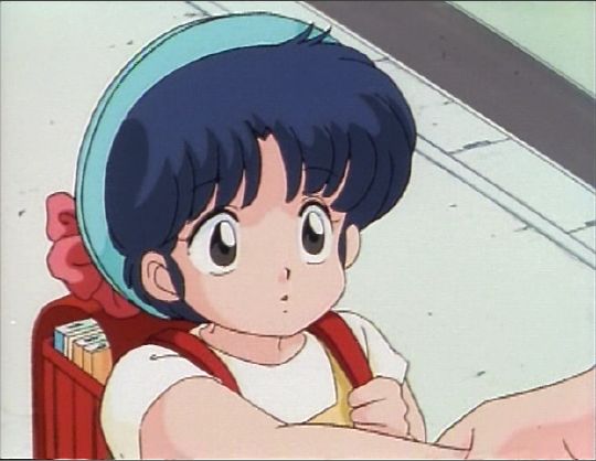 In a flashback to Akane as a child, Akane is being led to school by Kasumi (hand and arm visible in cel). Akane is thinking that, if she had long hair like Kasumi, Dr. Tofu would like her as he does Kasumi.
