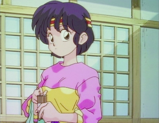 In the back yard of the Tendo residence, Akane is sitting with a towel and a drink can while talking to Ranma, suggesting that Ranma should take a break from his efforts to reproduce Ryoga's new technique and get some sleep..